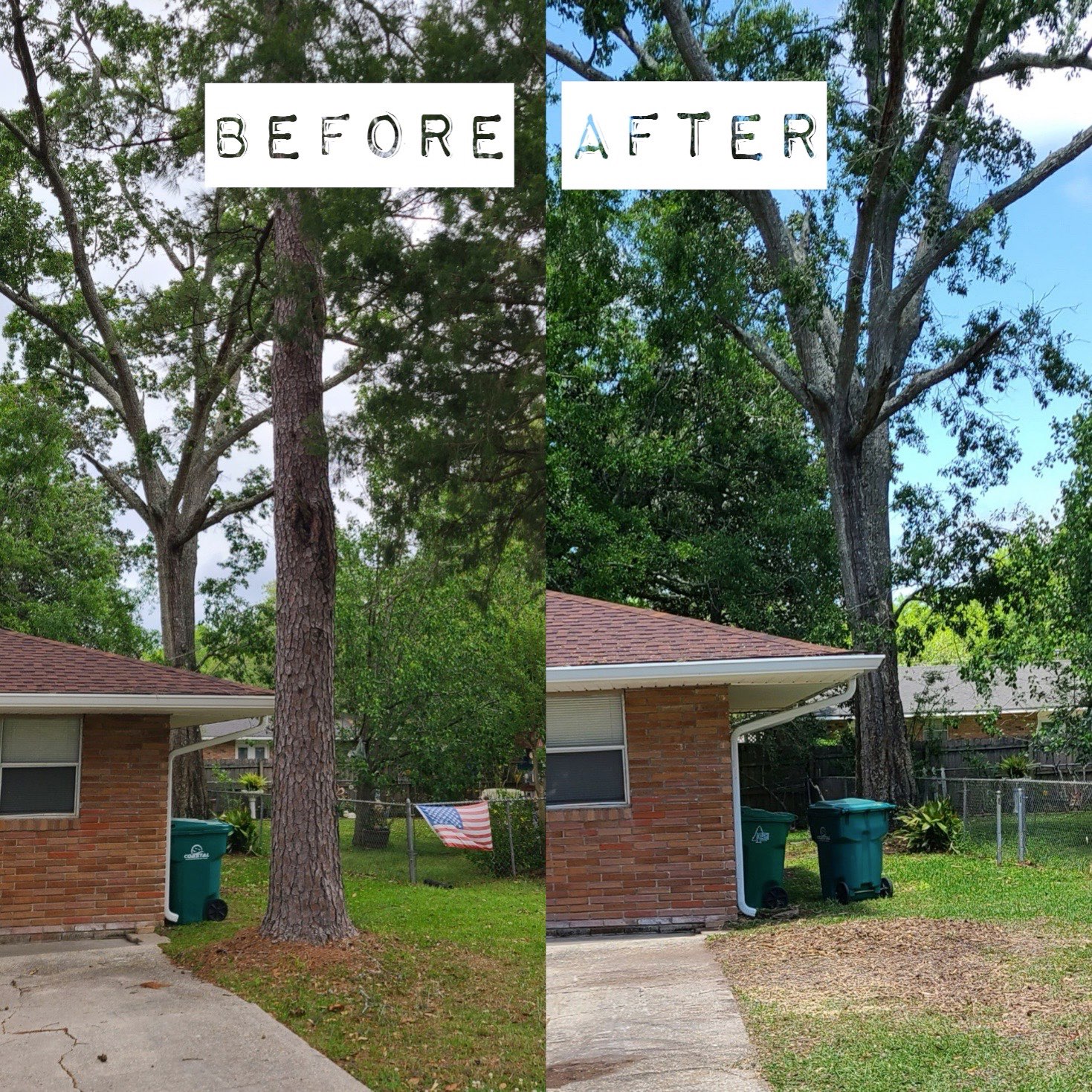 They arrived, got their equipment in place and David started climbing and cutting limbs. What fell to the ground was moved quickly and stacked. When only to trunk was left David cut every several feet on his way down. The brush/limbs had been placed so when the logs fell the brush provided some protection for our yard. They worked like a well oiled machine. They dropped 7 trees in a few hours. G. LeJeune Pearl River, La. See more See less